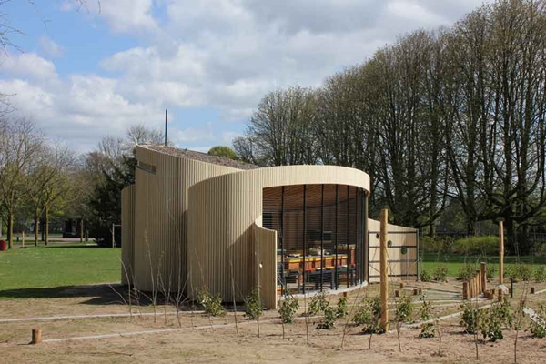 In het Nijmeegse Volkspark De Goffert is een biobased bijenpaviljoen gerealiseerd. Frank marcus Architecten heeft in het ontwerp het verschil tussen ‘bijentijd’ en ‘mensentijd’ tot uitdrukking gebracht.