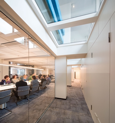 Het samenbrengen van alle kantoren, die verspreid over het gebouw waren gesitueerd, is een van de belangrijke ingrepen van Van Hoogevest. Het architectenbureau heeft in het souterrain een overwegend open kantoorruimte gecreëerd met activiteitgerichte zones. De inrichting is ontworpen door het bureau