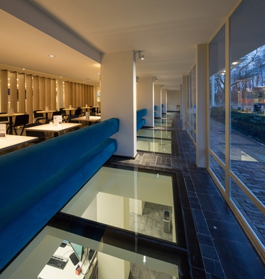Aan de singelzijde had het souterrain al ramen met fraai uitzicht. Om voldoende licht aan de andere zijde van de kantorenverdieping te krijgen, heeft Kuiper een greppel met ramen overwogen. “Het zou echter een knip tussen het monumentale park van Zocher en het monumentale gebouw betekenen. Dat wilden we niet.” Een oplossing is gevonden in een beloopbaar glas in de vloer van het bovengelegen Mevr. Dudok aan de raamzijde. In het dagcafé wordt deze strook vrijgehouden.