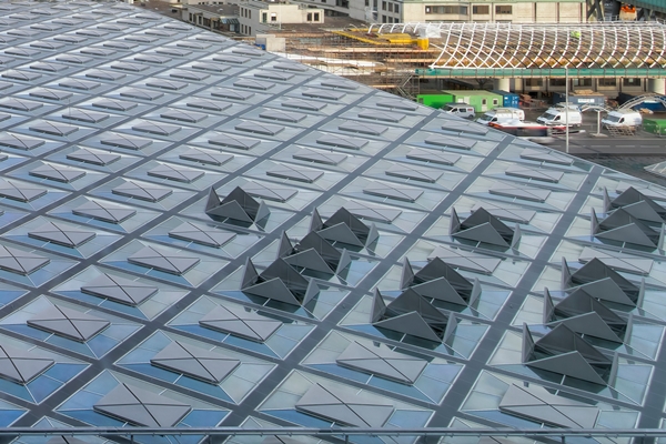 De diagrid-constructie van het glazen dak stabiliseert de rechthoekige hal. De overkapping bestaat uit diamantvormige daklichten op een web van gekruiste liggers met geïntegreerde verlichting. De constructie rust op slechts acht kolommen. Het 'wybertjes'-patroon zorgt voor een boeiend spel van schaduwen in de hal.