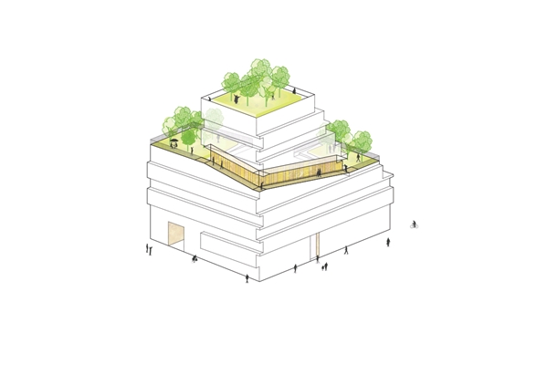 Zo dienen alle volumes een ‘uitsnede’ te krijgen. In het geval van het deel dat SeARCH ontwerpt loopt deze in een diagonale lijn en hij verbindt twee daktuinen op de vijfde en zevende verdieping. In totaal voorziet het project in 130 appartementen, 180 studentenwoningen, kantoren, commerciële ruimtes en een ondergrondse openbare parkeergarage.