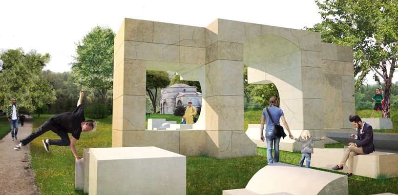 Met geabstraheerde vormen uit zandstenen blokken – vergelijkbaar met die van het historische bouwwerk – wil Adeyemi een constructie realiseren, die tegelijkertijd een beschutte ruimte, een doorgang en een raam op de Temple is.