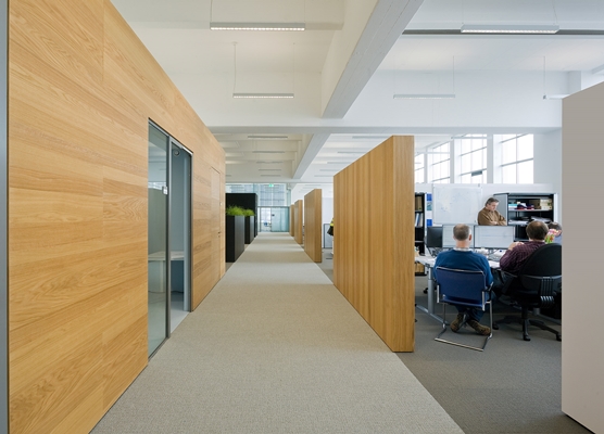 De verdiepingen zijn ieder minimaal vijf meter hoog. Om de industriële schaal van het pand zo goed mogelijk tot zijn recht te laten komen, zijn de werkvloeren zo open mogelijk gelaten. Faciliteiten als pantry’s, reproruimtes, overleg- en concentratieplekken zijn in vrijstaande volumes in de ruimte geplaatst om geluidsoverlast op de open werkvloer tot een minimum te beperken.
