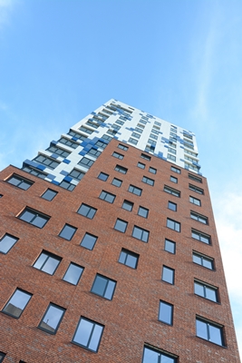 De woontoren is opgetrokken uit rood metselwerk en is aan twee kanten voorzien van beplating. De bakstenen variëren qua kleur en ook in het plaatwerk zitten schakeringen, van wit tot donkerblauw. Het hoge deel van de toren wordt naar boven toe telkens iets slanker.