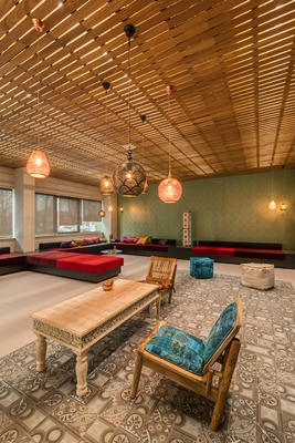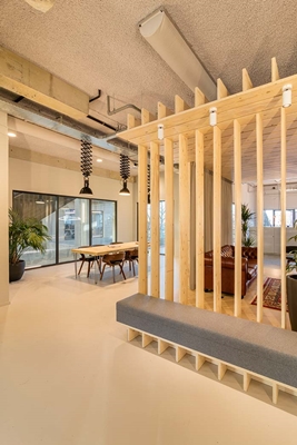 Het constructieve raamwerk van het atrium is gevuld met geperforeerde houten panelen en stalen puien. De wanden zorgen niet alleen voor akoestische kwaliteit, maar nemen tevens de pantry’s, bibliotheek, kastruimte en discplayplekken in zich op.