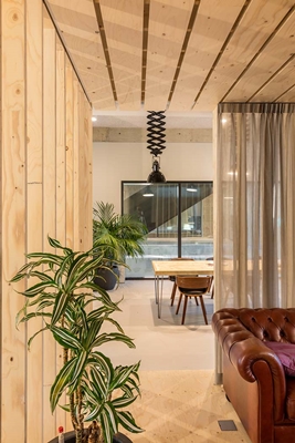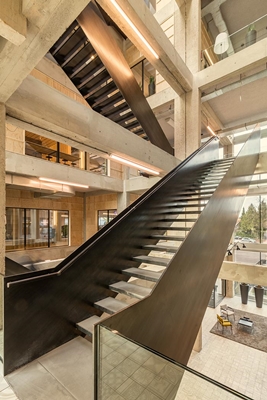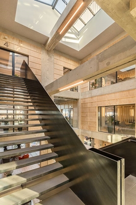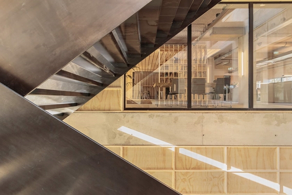 Verbinden was het leidend principe bij het ontwerp, meldt Studioninedots. De nieuwe vide speelt hierbij letterlijk een centrale rol. Door vloeren en wanden uit betonconstructie te verwijderen, ontstond een vier lagen tellende vide waarvan de verdiepingen ten opzichte van elkaar verspringen.