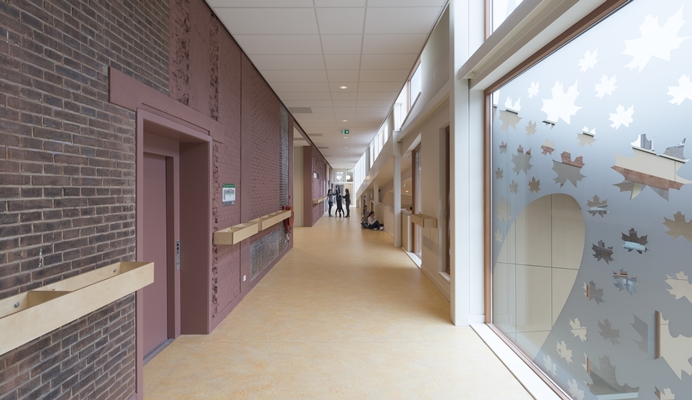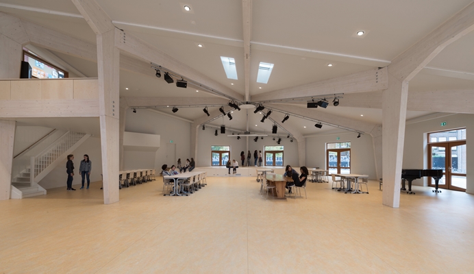 De nieuwbouw vormt het hart van de school: hier is de aula met uitzicht op de tuin gesitueerd. “Een hart dat symbool staat voor het familiegevoel van de school”, aldus de architecten. De ruimte kan tevens fungeren als professioneel theater.