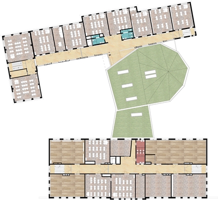 Op de plek van de gesloopte ateliers en werkplaatsen is de fundering grondig hersteld. Vervolgens heeft het architectenbureau de twee vleugels weer ruimtelijk verbonden door middel van nieuwe middenbouw. Tevens zijn er twee schoolpleinen gerealiseerd.