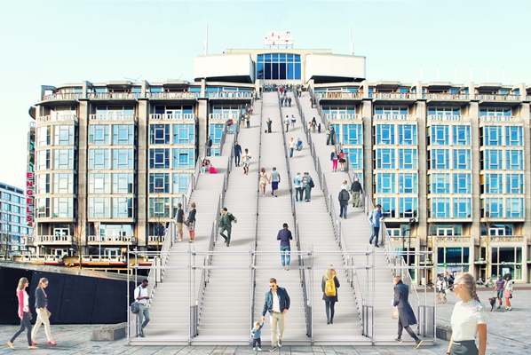 Op 16 mei wordt pal voor het Groothandelsgebouw in Rotterdam een tijdelijke trap geopend. De 180 treden tellende installatie is bedacht en ontworpen door
