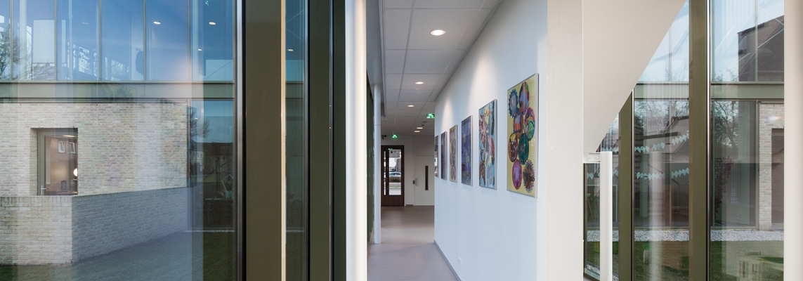 De horizontale structuur van het grote volume zet zich voort in de vliesgevel van de verbindingsgang met het ‘maatschappij-volume’. Aan weerszijden van de zogenoemde kunststraat ligt een patio: respectievelijk een stilte- en een ravotpatio. Beide zijn vormgegeven als buitenkamers.