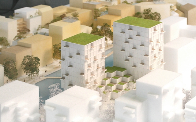 In plaats van één massief en groot volume heeft het architectenbureau gekozen voor twee slanke torens die onderin versmelten met een plint van terraswoningen. “De twee torens zijn op een ‘
