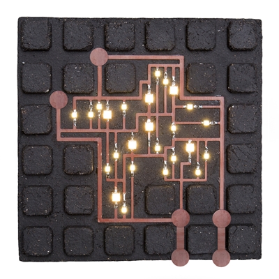 Van Kranen/Gille werd een tegelelement getoond, waarop een laag koper door een landschap van ‘gecultiveerde’ aarde meandert. De koperen laag verbindt op systematische wijze ‘steden’ die zijn te herkennen aan hun lichtjes.