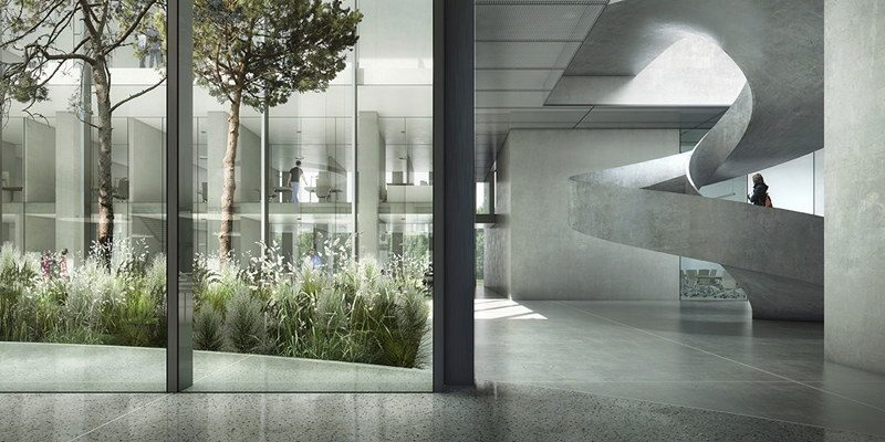 Met veel daglicht en radicale doorzichten vloeien gebouw en omgeving in elkaar over, meldt het bureau. De studieruimten krijgen een beslotenheid die vergelijkbaar is met die van een open plek in het bos.