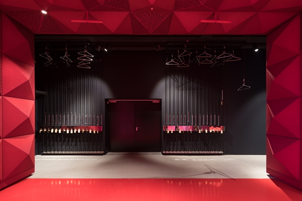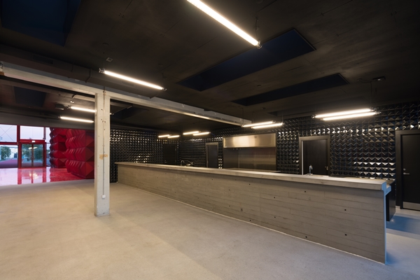 De helderrode kleur van de panelen van het interieur refereert aan de fluwelen binnenzijde van een gitaarkoffer. Ter contrast en versterking van het ‘rockgevoel’ is verder rauw beton toegepast.