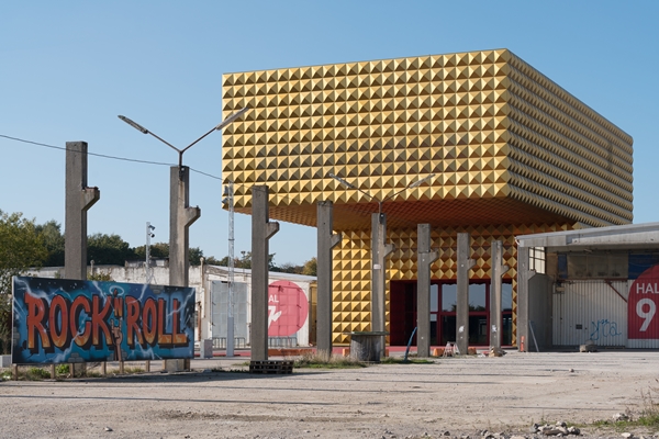 ontworpen gebouw is de ‘frontman’ binnen het nieuwe rockmuziekdistrict van de Deense stad. Opvallend zijn de ‘gouden’ gevel en de enorme uitkraging boven het voorplein.