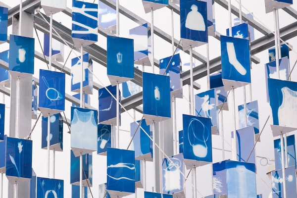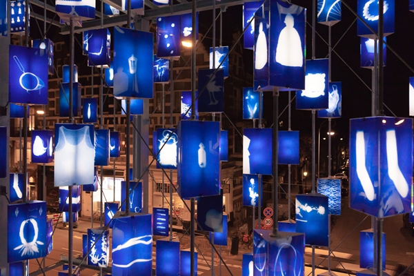 Met deze oude fototechniek worden alle kleuren omgezet in blauw/wit, waardoor de producten een gezamenlijke uitstraling hebben gekregen. De cyanotypes werden vervolgens gefotografeerd en afgedrukt op de lantaarns.