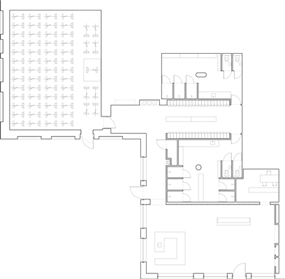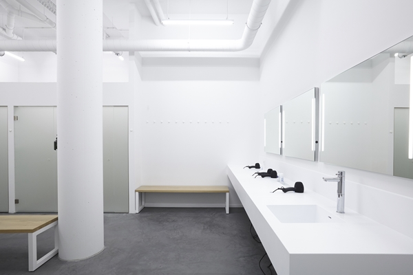 In een “unisex lockerspace” zijn de kluisjes verwerkt tot strakke, heldere wanden. Terwijl deze ruimte een vlotte wisseling tussen de verschillende lessen mogelijk maakt, is de lobby de centrale sociale ruimte waar de bezoekers zich kunnen melden, een sapje drinken of bijkomen in de grote raamkozijnen, met zicht op de Amsterdamse grachten.