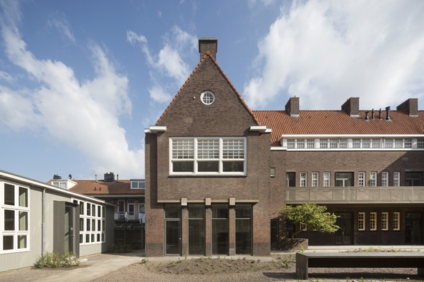 Drie woningen zijn in nauw overleg met Bureau Monumentenzorg Amsterdam opgenomen in het houten gebouwtje in de tuin. Dit gebouw is het enige overgebleven voorbeeld van de honderd noodscholen die na de oorlog zijn geïmporteerd uit Oostenrijk (in het kader van het Marshallplan). Het geprefabriceerde hout werd geruild tegen een paar ton verse vis, meldt XOOMlab.