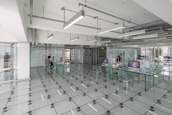 ervoor gekozen om het interieur volledig in glas uit te voeren: wanden, vloeren, liften, bureaus, enzovoorts.