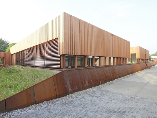De paviljoens hebben een houten gevel op een Cor-Ten-stalen plint; ze liggen deels verzonken in een groene wal. Op het met wilde grassen begroeide dak staat, verborgen onder een Cor-Ten-stalen kap, een luchtgekoelde warmte-koudepomp.