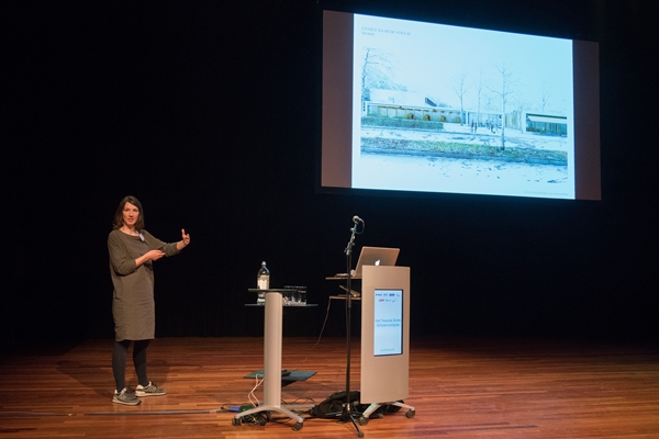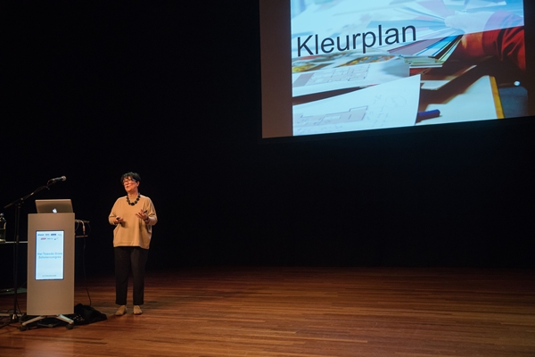 Wat betreft akoestiek en kunstlicht is het wel gebruikelijk om advies in te winnen bij experts op dat gebied, bij kleur is dat veel minder het geval, begon kleurexpert Fabienne Bruyninckx haar lezing. Terwijl kleur zoveel invloed heeft op het gemoed. Zo worden mensen in Noord-Europa niet alleen aangetrokken door lichte kleuren, maar ook door warme kleuren. In Zuid-Europa worden koelere kleuren weer aantrekkelijker gevonden. Op wanden waar daglicht valt werken volgens Bruyninckx blauwgrijze tinten erg goed: “Dat zorgt voor een ontspannen en natuurlijk gevoel.”