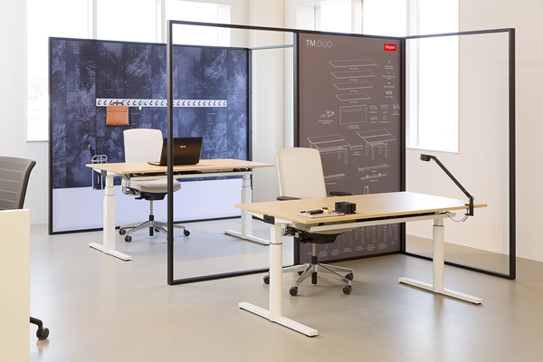 Gispen toont diverse opstellingen en mogelijkheden. Er is aandacht voor afzonderlijke segmenten, zoals Zorg, Onderwijs en Kantoor. Het interieur is fris en ruimtelijk door de witte vloer en wanden, in combinatie met transparante meubelen uit zwart stalen frames en houten bladen.