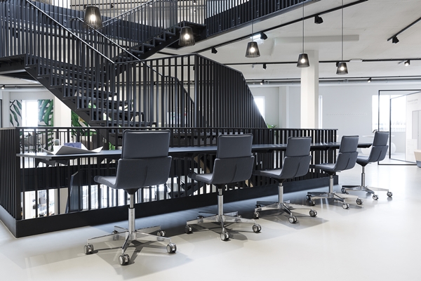 Transparantie is verder bereikt door de glazen scheidingswanden, gevat in zwart stalen kozijnen. Centraal staat een ontvangstmeubel uit zwart en naturel getint hout met de aansluitende trap, ontworpen door Mecanoo architecten.
