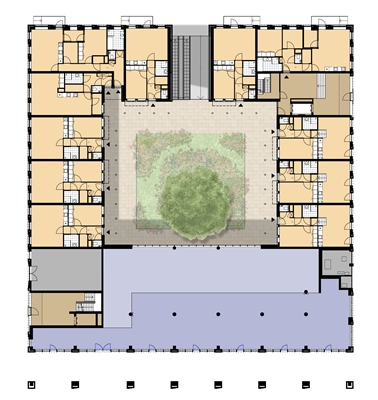 Op de begane grond bevindt zich een restaurant, terwijl een flauwe hellingbaan onder de dubbelhoge poort leidt naar een fietsenstalling en berging onder het binnenhof.
