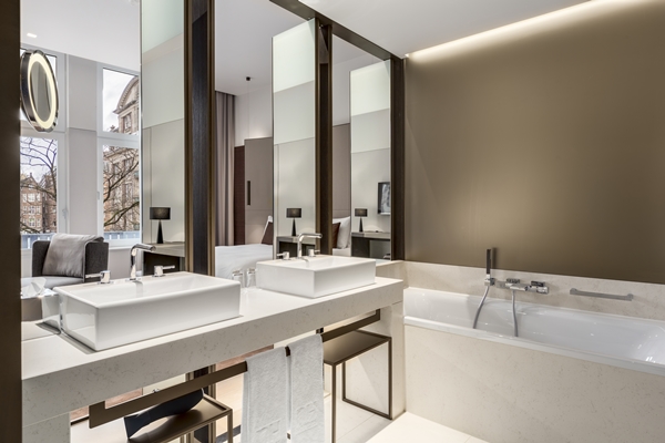 In beide concepten – ‘Modern Classic’ en ‘Classic Modern’ is gewerkt met een open badkamer. Inspiratie hiervoor was het sanitair in de kamer met een uitschuifbaar toilet, zoals ooit geïntroduceerd door A.W. Krasnapolsky. Om te breken met traditionele inrichting, staat het bed als een eiland in de ruimte.