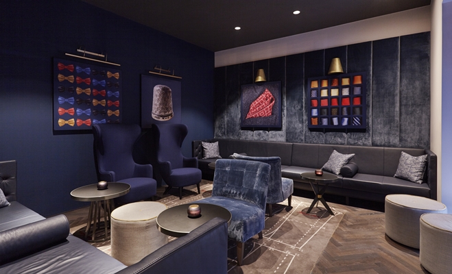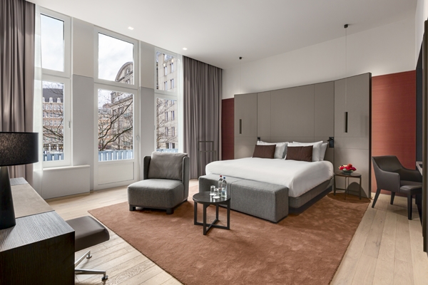 Een duidelijk lijnenspel in het tapijt geeft een gevoel van richting en structuur. De armaturen zorgen voor gedimd licht, wat bijdraagt aan rust en intimiteit. Voor de hotelkamers ontwikkelden D/DOCK en Esteve twee concepten “om de historie van het hotel en de toekomst van de stad te verenigen”, aldus D/DOCK.