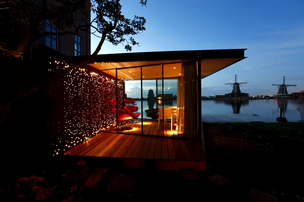 “Deze sublieme locatie, met zicht op de molens van de Zaanse Schans, vroeg wat ons betreft om een subtiele ingreep die rust en eenvoud zou uitstralen”, vertelt architect Remko Remijnse van 2by4-architects. “Om het zicht op de Zaan vanuit het achtergelegen woonhuis niet te belemmeren is het paviljoen zo transparant mogelijk gehouden en is de detaillering zo minimaal mogelijk gemaakt. Overdag is het paviljoen een bescheiden massa aan de rivier, ‘s avonds transformeert het paviljoen tot een baken van licht.”