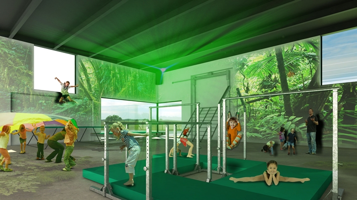 De Beweegbox wordt uitgerust met projectie, licht en geluid, legt RoosRos uit. Naast de traditionele sport- en spelmaterialen is het gebouw voorzien van onder andere een klimwand, spiegels en een enorme trampoline.