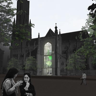 Het winnend ontwerp voorziet in grote kunstetalages in beide zijbeuken. De gemetselde wanden onder de glas-in-loodvensters worden vervangen door grote glazen deuren. De (wisselende) kunstwerken worden achter de grote gevelopeningen geëxposeerd en ’s avonds aangelicht met smalle bundels licht.
