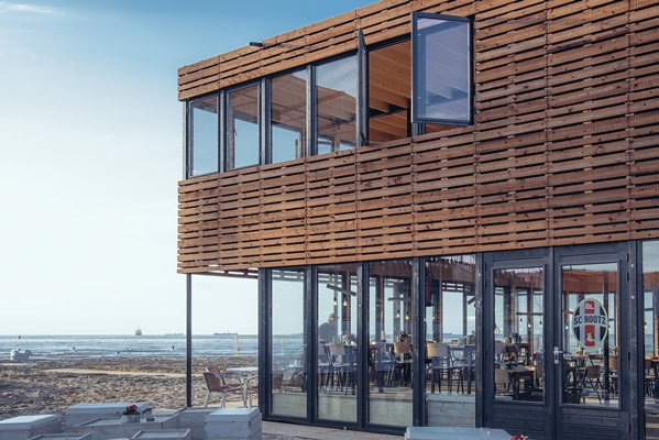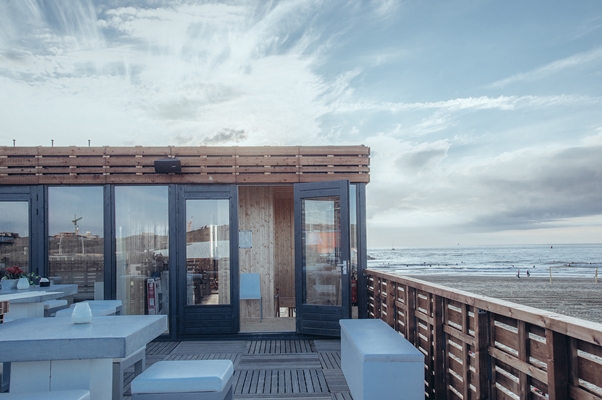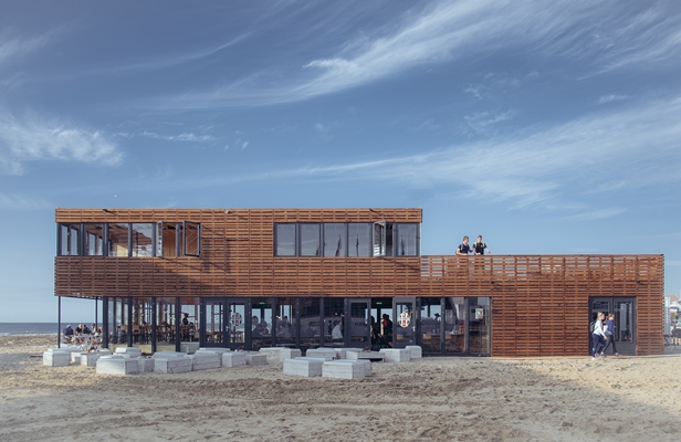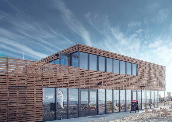 In het najaar wordt het paviljoen telkens afgebroken, om er in het volgende beachsportseizoen weer te staan. De demontabele bouwwijze, die doorgaans is af te lezen aan de gevel, is gemaskeerd door een tweede huid van houten latten. De houten gevel geeft het paviljoen een warme uitstraling en zorgt voor een helder spel tussen open en dicht, verklaren de architecten.