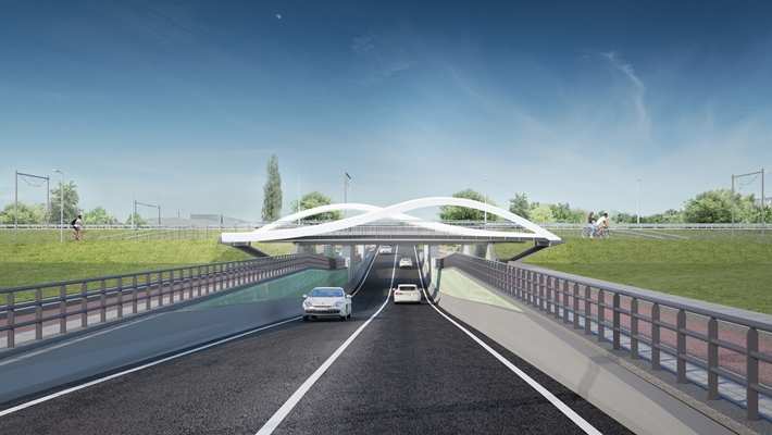 heeft de aanbesteding voor een brug over de fietssnelweg F35 in Enschede gewonnen. De fietsbrug krijgt een bijzondere boogvorm: door de traditionele vorm van de boog van dit soort bruggen uit elkaar te trekken, is een DNA-streng ontstaan. Deze vorm symboliseert het ‘DNA’ van Enschede, de regio Twente en het Kennispark, aldus de ontwerpers.