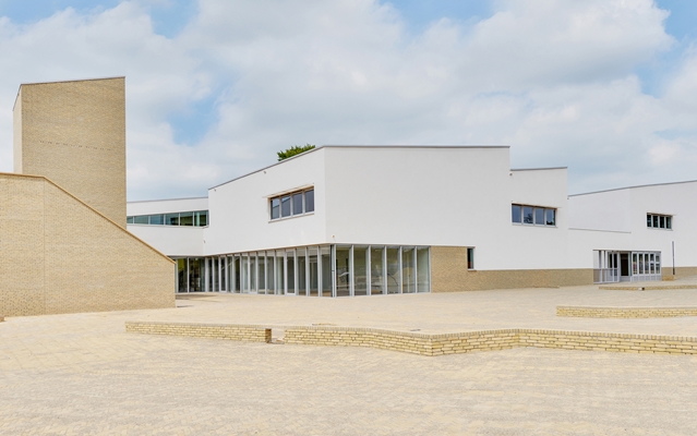 DAT heeft het gebouw opgedeeld in drie clusters, die in oost-west richting door middel van een dubbelhoge binnenstraat met elkaar zijn verbonden. Tussen de clusters bevinden zich op het zuiden twee hoven, zodat het gebouw zich richting het park opent en de bouwmassa voldoende geleed is ten opzichte van de nog te realiseren woningen rond het park. De witte kleur van het gebouw zal straks terugkomen bij die woningen. Op het noorden grenst het gebouw aan een boomgaard, die door de school gebruikt wordt als leertuin.