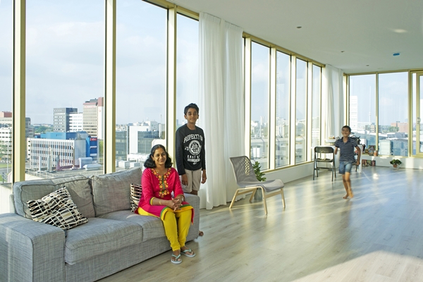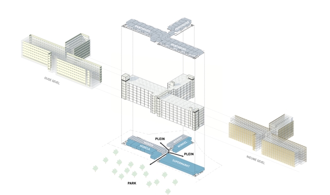 zijn ingevuld met lofts en penthouses voor veelal eenpersoonshuishoudens van starters en expats. Op de begane grond zit een supermarkt, diverse horeca en winkels, een fitness-studio en kantoren.