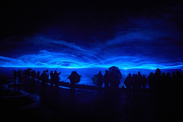 De beelden van het blauwe licht over het water rond de Afsluitdijk, een variant op het groene noorderlicht, werden massaal gedeeld op sociale media.