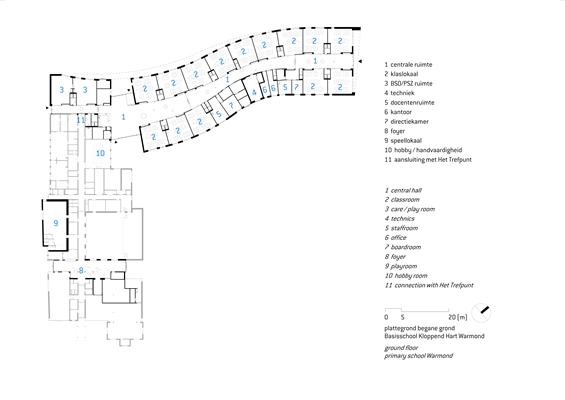 Het bestaande en het nieuwe deel zijn verbonden door een centrale ruimte. Deze gedeelde ruimte kan multifunctioneel worden gebruikt: als ontmoetingsruimte, als leerplek en als speelplek, bijvoorbeeld.