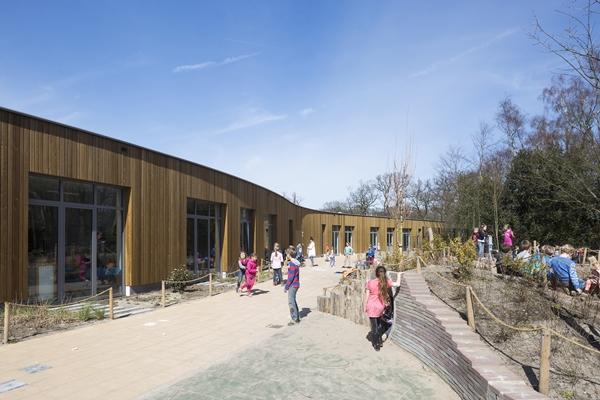 Het nieuwbouwdeel heeft atelier PRO ontworpen als een ‘kralensnoer’ van klaslokalen met een golvende vorm. De deel heeft een houten gevelbekleding, passend bij de groene en open locatie.