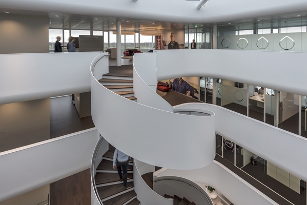 een open en transparant hoofdkantoor ontworpen, met een alzijdige oriëntatie op het omringende landschap en aandacht voor duurzaamheid. Het interieurontwerp van