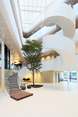 De functionele onderdelen van het programma zijn gesitueerd rondom de ontvangstruimte. Deze ruimte, in de vorm van een atrium, is de entree tot het kantoorgebouw en biedt plek aan de receptie. Omhoog kijkend in het atrium zie je de werkplekken, vergaderruimtes en een loopbrug. Via het glazen atriumdak valt het daglicht in deze binnenwereld.
