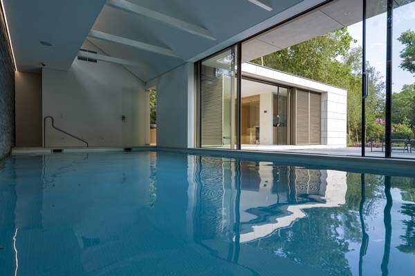 Vanuit de ontspanruimte is er een doorgang naar het zwembad, dat grotendeels de tweede poot van de L inneemt. In de doorgang zijn toilet en wastafel gesitueerd. Een doorkijk naar de bomen aan de achterzijde verankert het gebouw nog sterker in zijn groene omgeving.