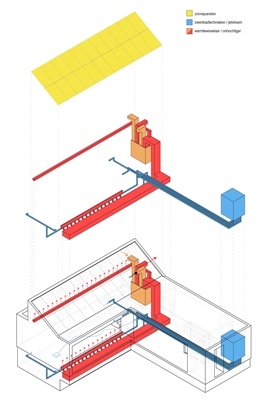 Andere toegepaste oplossingen zijn bijvoorbeeld de oriëntatie van het volume en het openvouwen van het dak richting het zuiden. De zuidgevel is voorzien van een luifel om te sterke opwarming in de zomer te voorkomen, terwijl de glazen puien wel ruim daglicht toelaten.