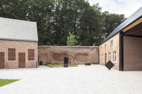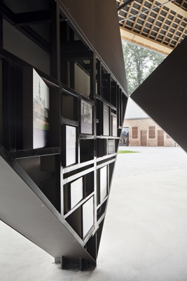 OMGEVING en B-bis architecten hebben ervoor gekozen om recente toevoegingen af te breken en het terrein een nieuwe begrenzing te geven in de vorm van een overdekte tentoonstellingsruimte. Deze ligt in het verlengde van de aanwezige boerderij.