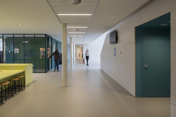 Voor de installaties is in de nok van het gebouw een installatiezolder vrijgehouden. Deze grenst aan de gangzones en toiletten, waar de plafonds lager zijn dan in de lokalen. Hierdoor ontstaat relatief weinig ruimteverlies en blijven de gevelzones volledig vrij indeelbaar, meldt atelier PRO.