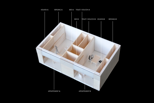 De flexibele indeling is mogelijk doordat de constructie van het gebouw is losgekoppeld van de woningwanden. Bovendien zijn functionele elementen als de keuken, het sanitair, opbergruimte en bedden weggewerkt in deze wanden. Bewoners kunnen de open ruimte naar eigen inzicht inrichten.