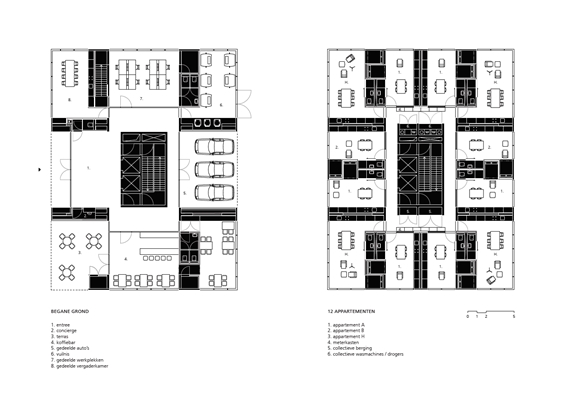 Op de begane grond bevinden zich naast de entree ook publieke werkplekken, parkeerplaatsen, een koffiebar en een terras. Het voor alle bewoners toegankelijke dak is vormgegeven als een gemeenschappelijke daktuin om bijvoorbeeld te barbecueën of dansen.