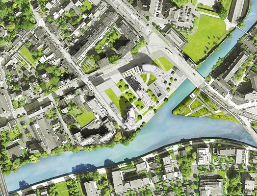 Het gebouw staat langs een nieuw aangelegde voetgangersboulevard die het centrum met dit deel van de stad verbindt. Naast de gemeenschappelijke buitenruimtes bevindt zich tussen het gebouw en de rivieroever een groot plein met aangelegen theater, horecagelegenheden en terrassen. Hier is ruimte om bijvoorbeeld uit te gaan en evenementen te organiseren.