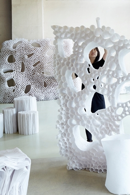 Ook Kathrine Barbro Dendixen maakt eveneens gebruik van een ecologisch ‘rest’-materiaal. ‘Inside Out’ is een lamp uit vijftig meter gereinigde en opgeblazen koeiendarm, voorzien van ledlicht. De kronkelende vorm en parelmoerachtige glans zijn natuurlijk. De lampen zijn vergankelijk.